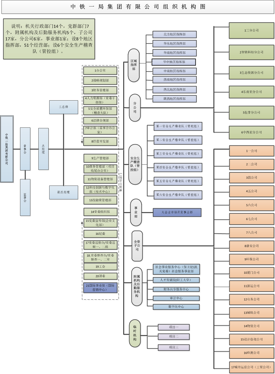 集團公司機關本部共設置21個部門,其中行政部門14個,黨群部門7個(黨委巡察辦、黨委督查辦為一套管理人員,履行相應職責)。行政部門具體為辦公室(黨委辦公室、董事會辦公室、保密委員會辦公室)、戰(zhàn)略規(guī)劃部、財務管理部、人力資源部(黨委干部部)、安全質(zhì)量環(huán)保部(稽查大隊)、法律合規(guī)部、審計部(監(jiān)事會辦公室)、經(jīng)營開發(fā)部、生產(chǎn)管理部、商務管理部(項目收尾辦公室)、科技創(chuàng)新與數(shù)字化部、物資設備管理部、投融資管理部、國際事業(yè)部(國際營銷中心);黨群部門具體為黨委組織部、黨委宣傳部(企業(yè)文化部)、紀委、黨委巡察辦、黨委督查辦、工會、團委。集團公司下設8個地區(qū)指揮部,51個經(jīng)營部,負責經(jīng)營開發(fā)工作;設6個安全生產(chǎn)稽查隊(管控組)負責安全監(jiān)管工作。集團公司下設17家子公司、6家分公司、1家事業(yè)部。具體信息附圖