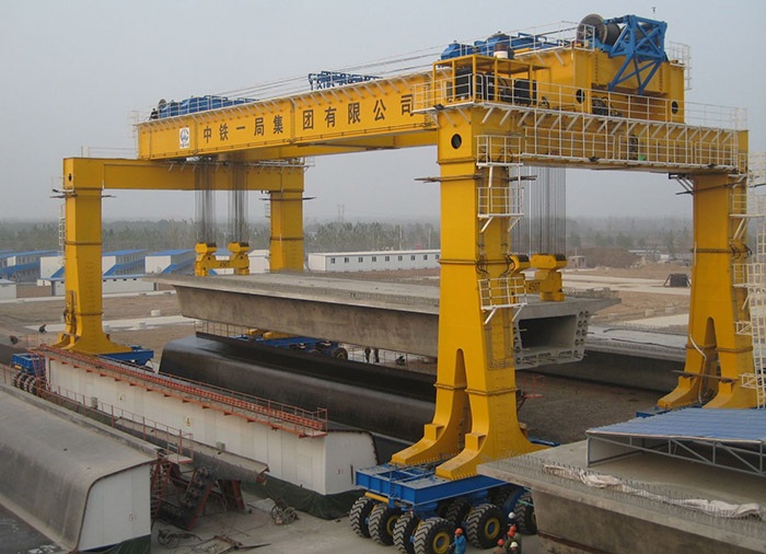 輪式提梁機(jī)適用于高速鐵路32m、24m、20m雙線900t箱梁在制梁場范圍內(nèi)的臨時(shí)移動(dòng)、配合900t輪胎式運(yùn)梁車或相同類型運(yùn)梁車提梁裝車。