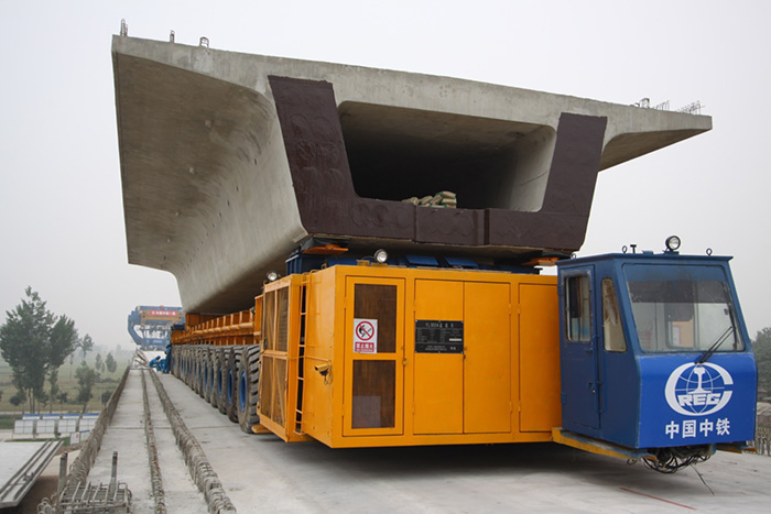900t輪胎式運梁車的工作地點位于已經(jīng)架設好橋梁頂面。有提梁機將預制箱梁提升并裝載到運梁車上,再由運梁車運輸至架橋機架設工位。