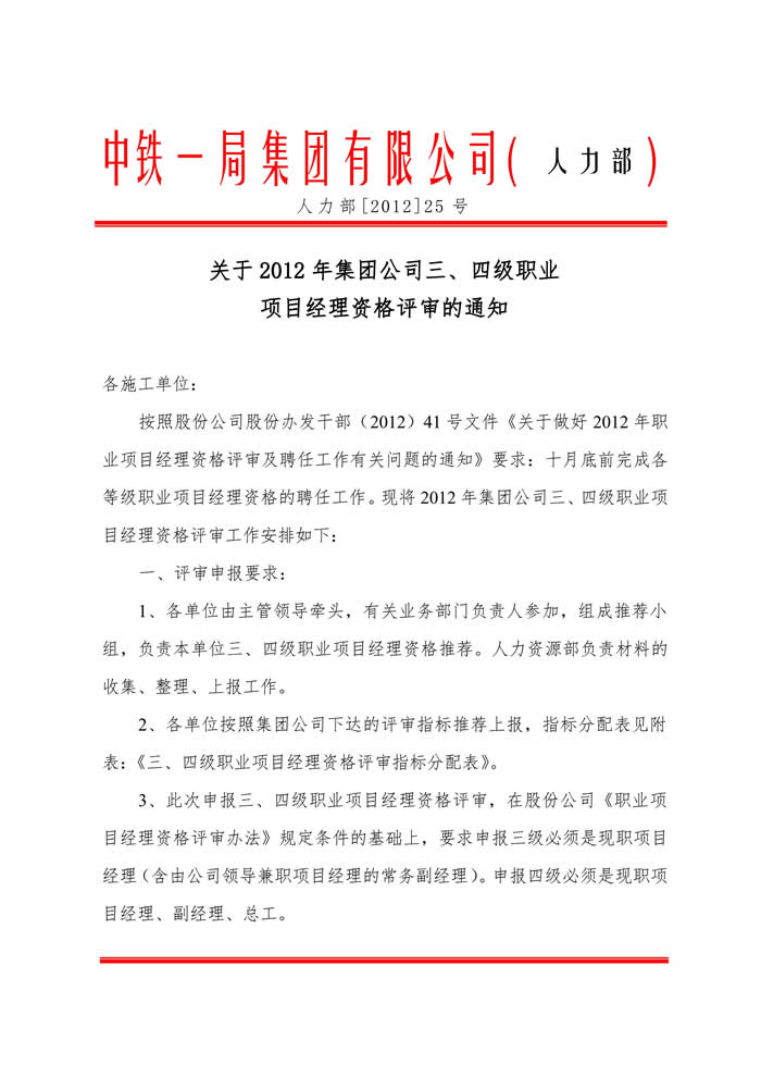 關(guān)于2012年集團(tuán)公司三、四級(jí)職業(yè)項(xiàng)目經(jīng)理資格評(píng)審的通知