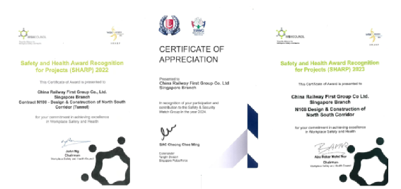 2019年,三公司成功叩開標準嚴苛的新加坡市場,中標南北走廊N108項目,實現了在國際高端工程領域從“零”到“一”的重大突破。項目實施期間,團隊自主完成地連墻及鋼支撐等關鍵工序,憑借卓越的工程質量與安全管理,2023年、2024年連續(xù)榮獲新加坡人力部頒發(fā)的“職業(yè)健康與安全先鋒獎”,2024年、2025年連續(xù)兩年蟬聯(lián)新加坡警察部隊“安全管理榮譽證書”,充分彰顯了企業(yè)在高端市場的卓越品牌影響力與技術創(chuàng)新實力。