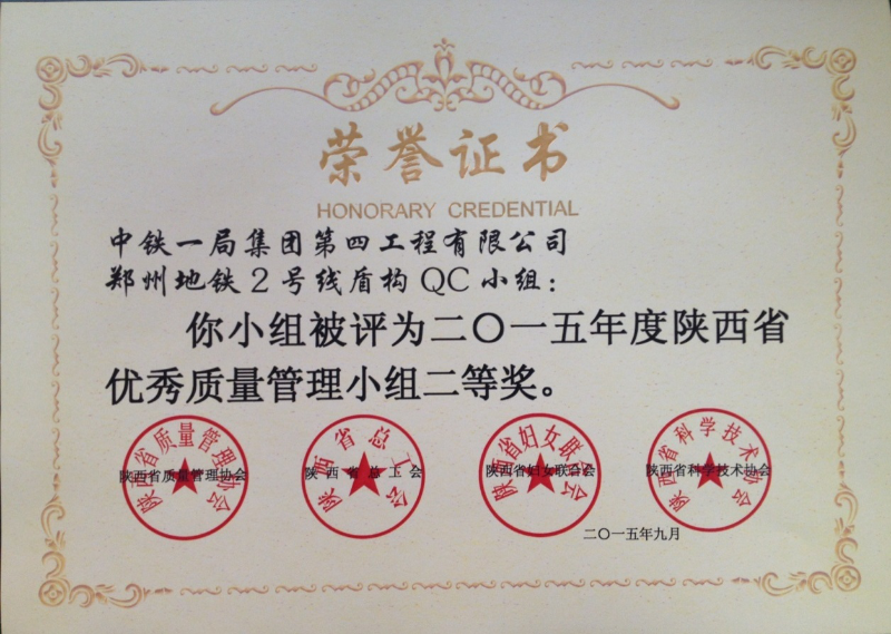 鄭州地鐵2號線盾構(gòu)QC小組被評為2015年陜西省優(yōu)秀質(zhì)量管理小組二等... -