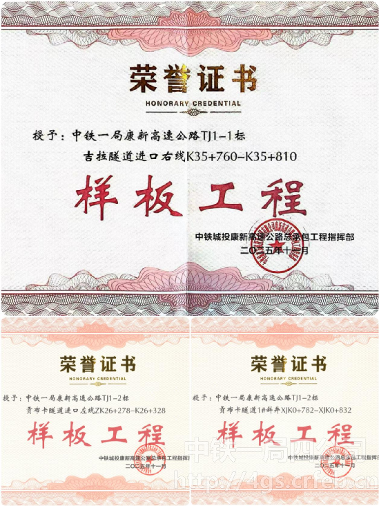 近日,公司康新高速公路1標、2標項目紛紛傳來捷報:貢布卡隧道1#斜井、貢布卡隧道進口左線,吉拉隧道進口右線均被中鐵城投康新高速公路總承包工程指揮部授予“樣板工程”榮譽稱號,成為全線建設的標桿典范。