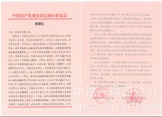 近日,公司收到重慶市巴南區(qū)委、區(qū)政府發(fā)來(lái)的感謝信,信中對(duì)中鐵一局在渝廈高鐵重慶至黔江段建設(shè)中作出的貢獻(xiàn)表示衷心感謝,并對(duì)雙方合力推動(dòng)巴南經(jīng)濟(jì)社會(huì)高質(zhì)量發(fā)展取得的成效給予高度肯定。