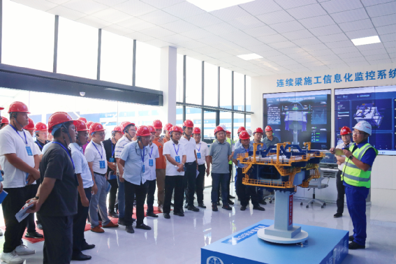 在江東特大橋43#墩智慧造橋機施工現(xiàn)場,交流團一行首先觀看了工藝工裝和智慧造橋機應用專題匯報視頻。項目技術負責人通過“3D模型和信息化系統(tǒng)可視化演示”,詳細介紹智慧造橋機在施工精度控制、結構穩(wěn)定性監(jiān)測及自動化作業(yè)等方面的創(chuàng)新應用;隨后,交流團實地察看橋梁“五小四新”應用成果,近距離觀察智慧造橋機承重桿件等組成部分,對項目團隊在工藝工裝創(chuàng)新應用、智慧化建造探索等方面的工作給予高度評價。
