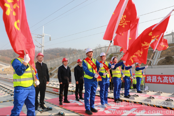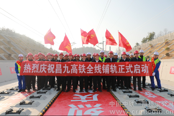 昌九城際鐵路公司黨委書記、總經(jīng)理郭建光,副總經(jīng)理羅少華,昌九城際鐵路公司昌九指揮部指揮長(zhǎng)夏小任,中鐵一局副總經(jīng)理潘小虎,八公司黨委書記、執(zhí)行董事秦定松,新運(yùn)公司總經(jīng)理李怡,八公司副總經(jīng)理張忠文,新運(yùn)公司副總經(jīng)理岳恒利及設(shè)計(jì)、監(jiān)理等單位代表出席了鋪軌啟動(dòng)儀式并為參建者授旗。