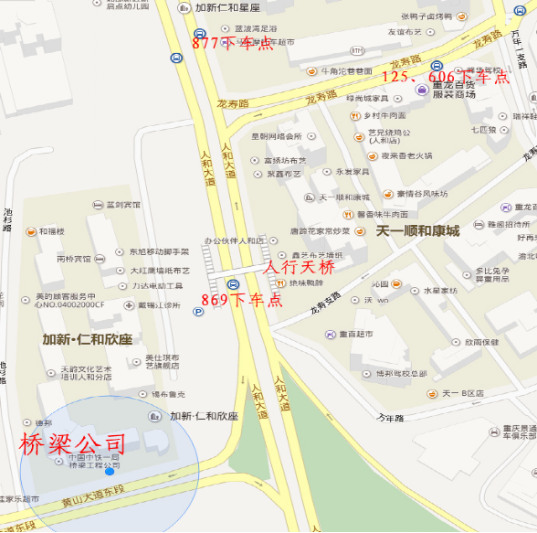 乘坐869路公交車,到人和(人和站馬路兩邊站點(diǎn)均停車,第二次停車<第一次停車為后附地圖中877下車點(diǎn)>)下車,前方右側(cè)即可看到公司,前行拐角處右轉(zhuǎn)后下行100米右側(cè)即到;