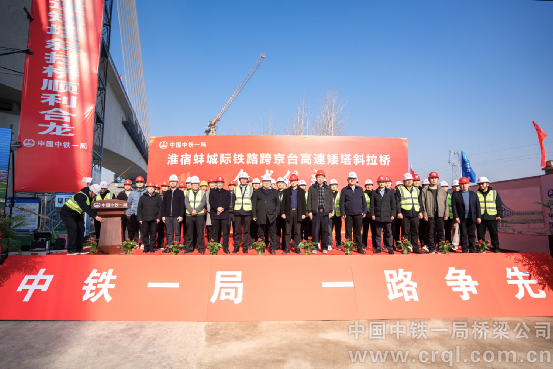 上海鐵路局合肥樞紐宿州指揮部指揮長王義寶、副指揮長武佩峰;宿州市發(fā)改委副主任李望濤;中鐵上海設(shè)計院集團(tuán)淮宿蚌城際鐵路配合施工指揮部指揮長王建春;鐵四院(湖北)工程監(jiān)理咨詢有限公司淮宿蚌三標(biāo)監(jiān)理站副總監(jiān)曾德奎;中鐵一局橋梁高級專家、副總工程師閔擁軍,華東管控組副組長郭應(yīng)忠,八公司執(zhí)行董事、黨委書記秦定松,淮宿蚌III標(biāo)項目經(jīng)理張偉,八公司副總經(jīng)理史維康等在現(xiàn)場見證合龍。