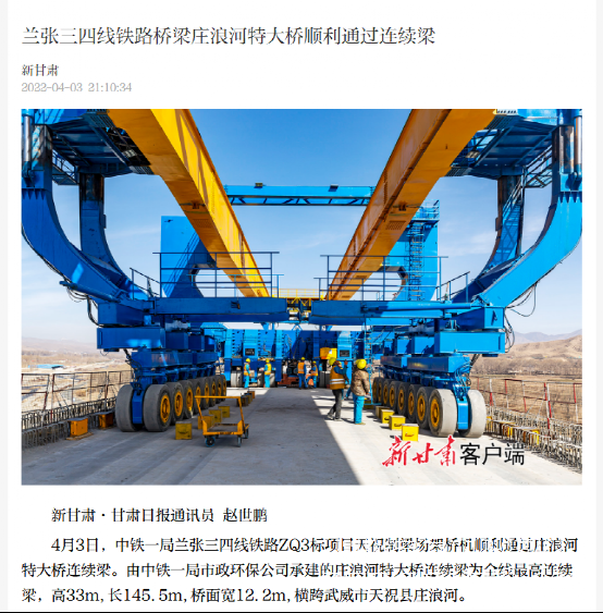 4月3日,新甘肅報(bào)道:蘭張三四線鐵路橋梁莊浪河特大橋順利通過連續(xù)梁