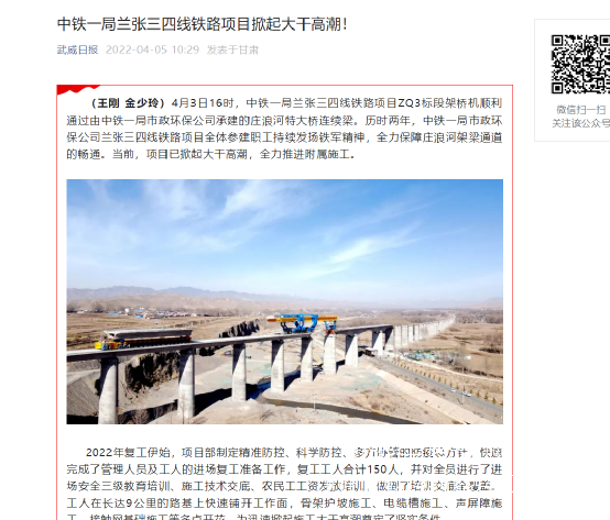 武威日?qǐng)?bào)報(bào)道:中鐵一局蘭張三四線鐵路項(xiàng)目掀起大干高潮!