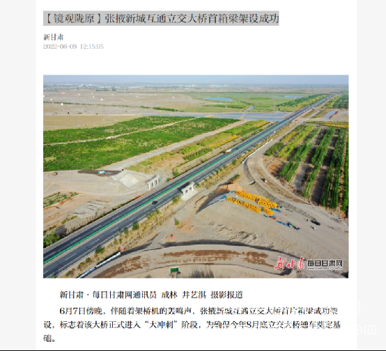多家媒體報道公司承建的張掖新城互通立交大橋首箱梁架設(shè)成功