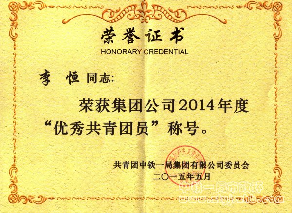 李恒榮獲集團公司2014年度“優(yōu)秀共青團干部”稱號