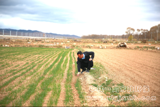 杜建軍俯身查看高鐵沿線青苗長勢