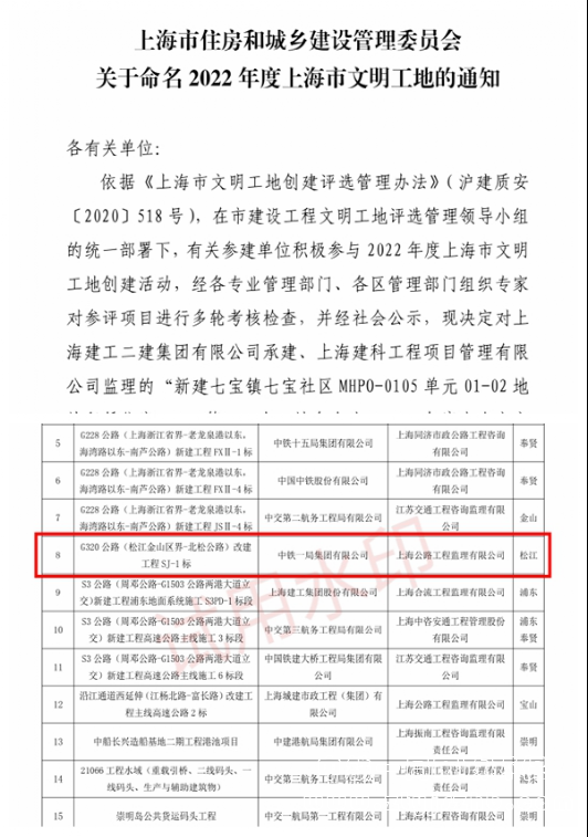 公司G320公路改建項(xiàng)目榮獲“2022年度上海市優(yōu)秀文明工地”稱號(hào)