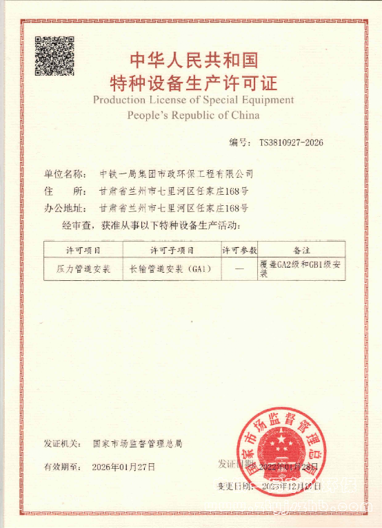 中國(guó)中鐵首家!公司成功取得特種設(shè)備壓力管道安裝長(zhǎng)輸管道(GA1)許可