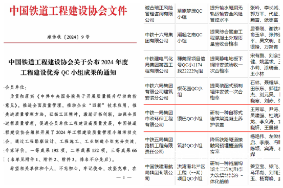 近日,從中國鐵道工程建設協(xié)會傳來喜訊,公司銀巴支線鐵路項目“銀巴QC小組”發(fā)布的《研制一種自移式連續(xù)梁混凝土養(yǎng)護裝置》成果,榮獲2024年度工程施工優(yōu)秀QC小組成果(國家級)“一等成果”榮譽稱號,并獲批國家知識產(chǎn)權局頒發(fā)的國家實用新型專利。同時該小組發(fā)布的《鉆孔樁樁頭破除工藝創(chuàng)新》成果,榮獲2024年度陜西省建筑業(yè)協(xié)會(省部級)優(yōu)秀QC小組成果“一等成果”。