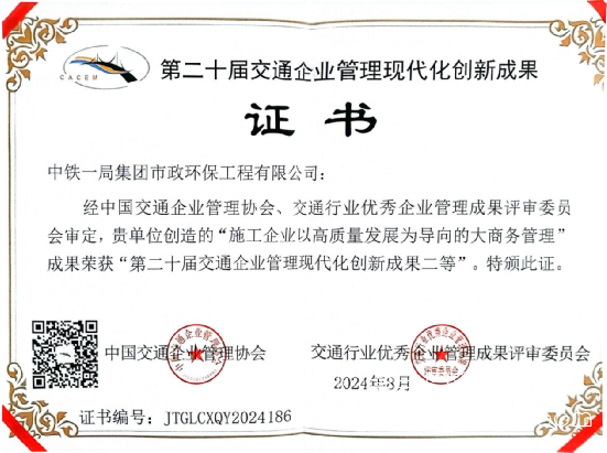 近日,第二十屆交通企業(yè)管理創(chuàng)新年會(huì)在河北省唐山市召開。公司提交的《施工企業(yè)以高質(zhì)量發(fā)展為導(dǎo)向的大商務(wù)管理》成果從管理理念、機(jī)制、方式方法、規(guī)章制度等方面出發(fā),以科學(xué)的方式、獨(dú)到的舉措全面闡釋公司近年來在落實(shí)大商務(wù)管理方面的系統(tǒng)性思考,榮獲“第二十屆交通企業(yè)管理現(xiàn)代化創(chuàng)新二等成果”榮譽(yù)稱號(hào)。