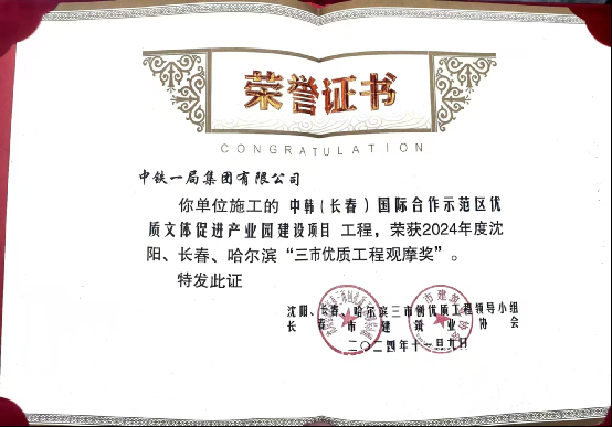 中韓(長(zhǎng)春)國(guó)際合作示范區(qū)優(yōu)質(zhì)文體促進(jìn)產(chǎn)業(yè)園建設(shè)項(xiàng)目榮獲2024年度沈陽(yáng)、長(zhǎng)春、哈爾濱“三市優(yōu)質(zhì)工程觀摩獎(jiǎng)”