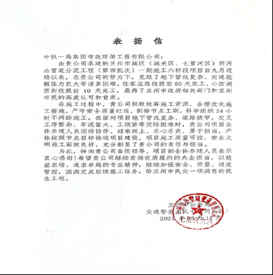 近日,由公司承建的蘭州市城區(qū)(城關(guān)區(qū)、七里河區(qū))雨污水管道分流工程(第四批次)一期施工六標(biāo)段項(xiàng)目任家莊路段提前50天完工、小西湖西街段提前10天完工,實(shí)現(xiàn)還路于民。蘭州市公安局交警支隊(duì)七里河大隊(duì)為表彰項(xiàng)目部?jī)?yōu)質(zhì)高效提前完工,給項(xiàng)目部送去“警企攜手建精品工程、高效施工顯工匠精神”的錦旗。