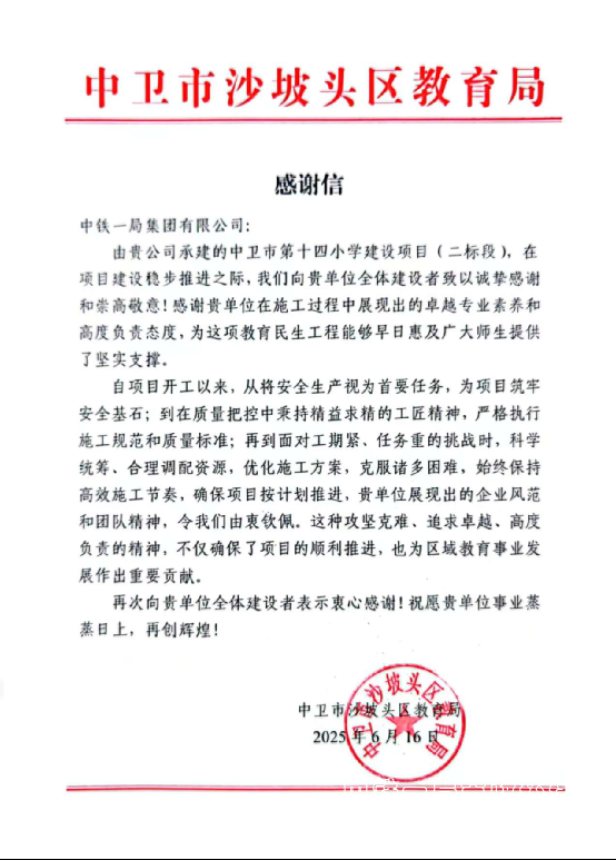 6月16日,中衛(wèi)市沙坡頭區(qū)教育局向中鐵一局集團(tuán)中衛(wèi)市第十四小學(xué)建設(shè)項(xiàng)目(二標(biāo)段)發(fā)來感謝信,對(duì)項(xiàng)目在中衛(wèi)市沙坡頭區(qū)重點(diǎn)教育工程建設(shè)中展現(xiàn)出的卓越履約能力、創(chuàng)新攻堅(jiān)精神和高度責(zé)任感給予充分肯定。