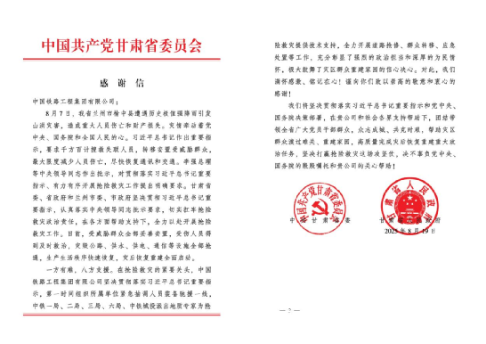 近日,中共甘肅省委在致中國(guó)鐵路工程集團(tuán)有限公司的感謝信中,特別提及并肯定了中鐵一局在此次救災(zāi)中的突出貢獻(xiàn),稱贊其用實(shí)際行動(dòng)詮釋了“一方有難、八方支援”的精神,彰顯了強(qiáng)烈的政治擔(dān)當(dāng)與深厚的為民情懷。