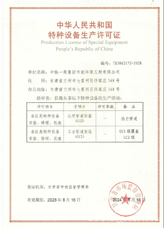 中國中鐵唯一!市政環(huán)保公司成功取得所有特種設備壓力管道安裝許可