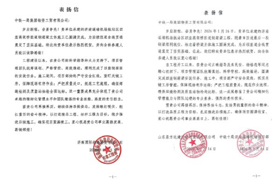 各方發(fā)來的表揚信,既是祝賀也是肯定。業(yè)主單位濟南國際機場建設有限公司在表揚信中寫道:“歲啟新程,奮勇爭先!貴單位承建的濟南遙墻機場航站區(qū)四座高架橋匝道鋼箱梁主體施工已圓滿完成,為后續(xù)匝道全線貫通奠定了堅實基礎。特此向貴單位表示熱烈祝賀,并向全體參建人員致以誠摯感謝!” 信中對分公司卓越的精細化管理水平、團隊精湛的專業(yè)技能和高度的責任擔當給予了充分贊譽,也表達了業(yè)主單位對項目管理再接再厲、打造精品標桿工程的殷切希望。