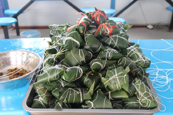 包粽子初,大家都躍躍欲試,信心滿滿,一個(gè)包下來(lái)發(fā)現(xiàn),不是米漏出來(lái)就是線綁不好,大家的技術(shù)水平參差不齊,不過(guò)無(wú)論是技術(shù)嫻熟還是新手上路大家都特別開(kāi)心,食堂里洋溢著歡聲笑語(yǔ)。經(jīng)過(guò)大家的辛勤勞作,上百個(gè)形態(tài)各異的粽子完成了,濃香的粽子味道飄滿整個(gè)食堂!