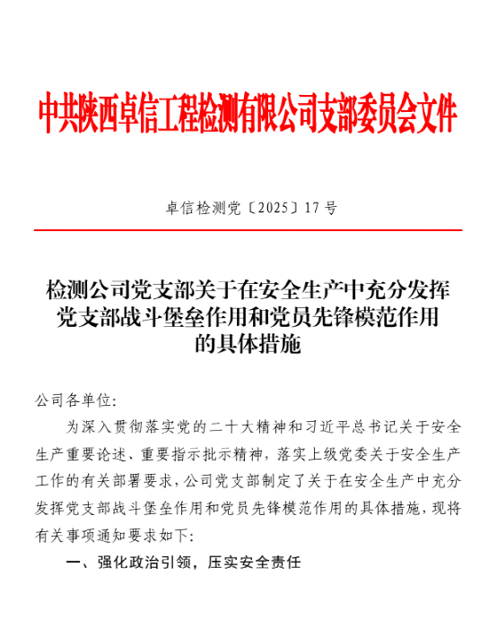 聚焦問題導向,筑牢安全防線。公司黨支部利用“三會一課”、月度例會等契機,對公司安全管理責任落實,試驗檢測作業(yè)安全、消防安全、行車安全、易制毒易制爆物品管理等工作進行安排部署,組織黨員開展安全隱患排查,將安全生產實績與黨員創(chuàng)崗建區(qū)、評先評優(yōu)、績效考核等工作掛鉤,不斷調動黨員抓安全、保安全的積極性與主動性。