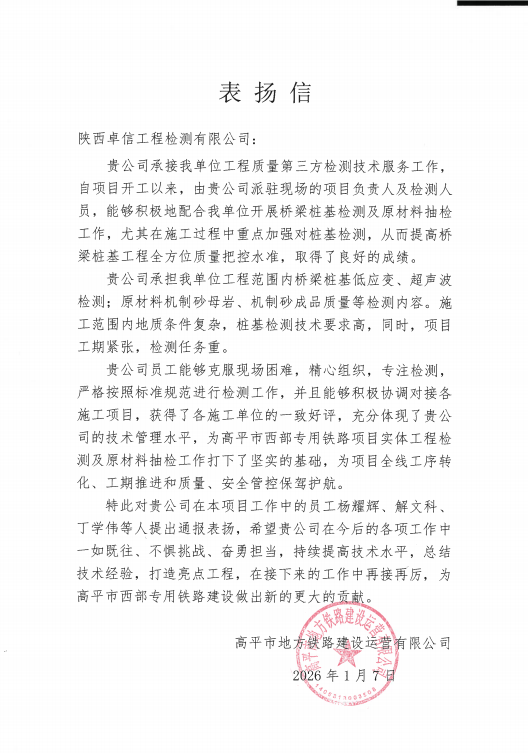 近日,高平市地方鐵路建設(shè)運(yùn)營(yíng)有限公司向公司發(fā)出表?yè)P(yáng)信,對(duì)其在高平市西部專用鐵路項(xiàng)目中的專業(yè)技術(shù)服務(wù)與貢獻(xiàn)給予肯定和表?yè)P(yáng)。